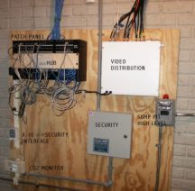 - Video distribution system: Uses an eight output by three input distribution amplifier to provide eight video outlets. The inputs are used for the incoming cable signal and outputs from stereo A/V to RF modulators attached to a VCR and DVD player. The modulators allow any TV on the system to watch the VCR or DVD player by tuning to the modulator's channel.