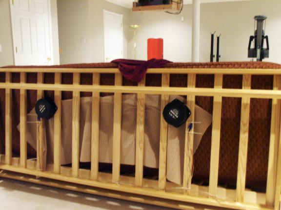 I've mounted both units under the main couch in the theater, a futon. I screwed them directly to the frame using some 1/2" screws. The units have a 4 ohm impedance so I decided to connect them in series to present the amplifier with an 8 ohm load.